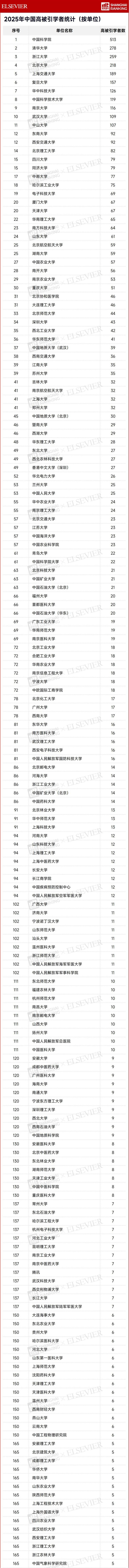 从机构发布看,2025年中国高被引学者所属机构中,中国科学院拥有最多的高被引学者,共513位。